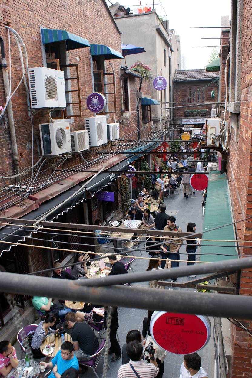 Oh here’s an alley. I couldn’t get a complete shot of it, but there it is and I am on top of a roof or something. They’ve used every bit of space there, you know . They’ve turned it into a sort of al fresco dining experience. The alley is very interesting as its a passageway that is at times fully impeded. It’s a kind of impassable passageway.