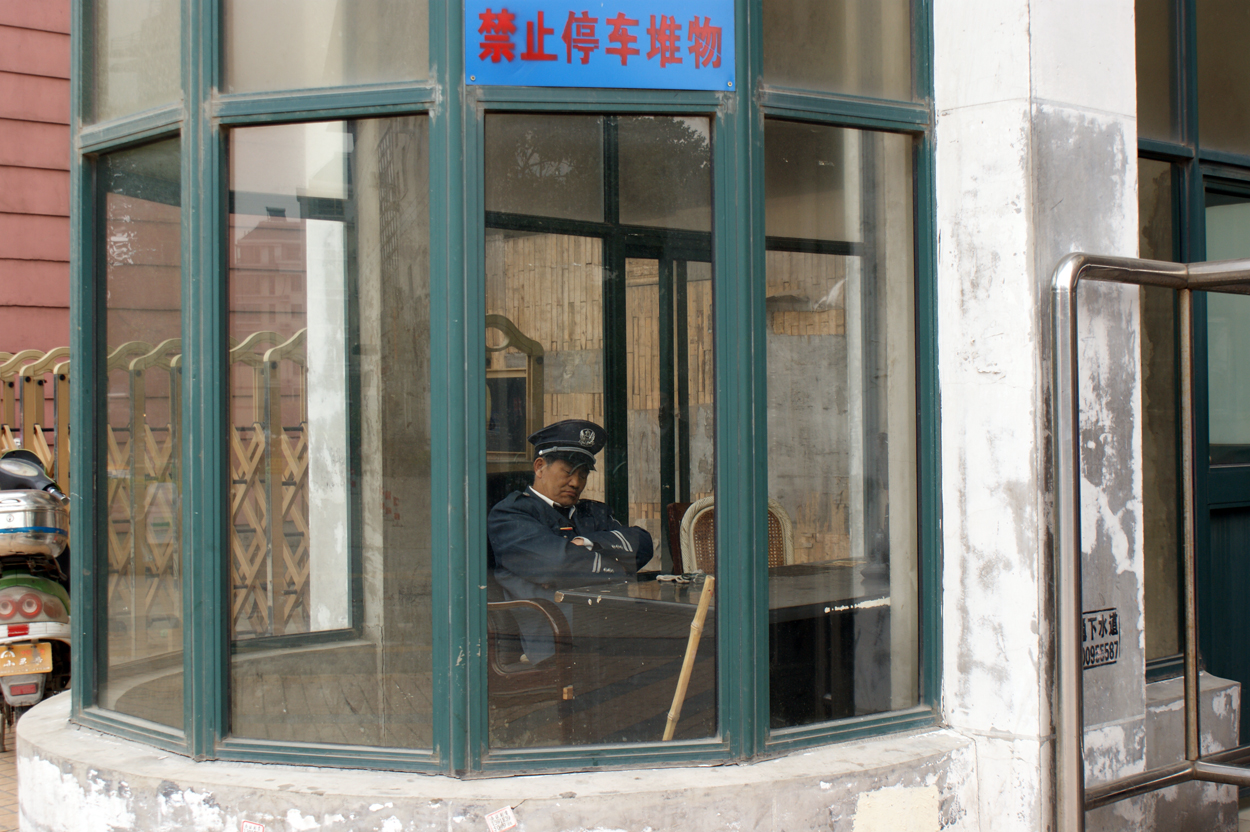 Now here is another view of a guard shack, and you can see much better the inside of this one. Now that is the gate he is guarding behind him. I just love this view. I think that the accordion gate and then the sleeping official – it just offers so much gratification. The situation is really marvelous and really communist China in spirit. Also you might notice the pole leaning against the desk there – the official might be napping but I wouldn’t want to test this premise just in case that’s not the case. Now if you imagine yourself quietly inching back away from the Guardhouse and you turnaround and…