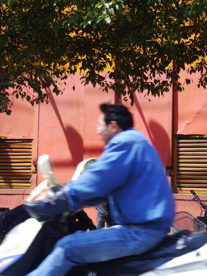 Now this is an image of a man with a pole on a bike photographed by Emily Woodward. Emily was sitting next to me in the back seat of a taxi when we saw this man pass by. It is actually not unusual at all to see all manner of goods loaded, or more often overloaded onto bicycles. As bikes and scooters are one of the primary forms of transportation they tend to come up with fairly novel and often quite complex means for transporting large loads of materials – which is actually quite canny. The pole is probably 3 or 4 times the man’s height but he seems quite adept at carrying it aloft while on his journey. Once again this is just another example of the kind of the xtra-reality of the place. Of course here you can only catch the very end of the back wheel …. there it is.